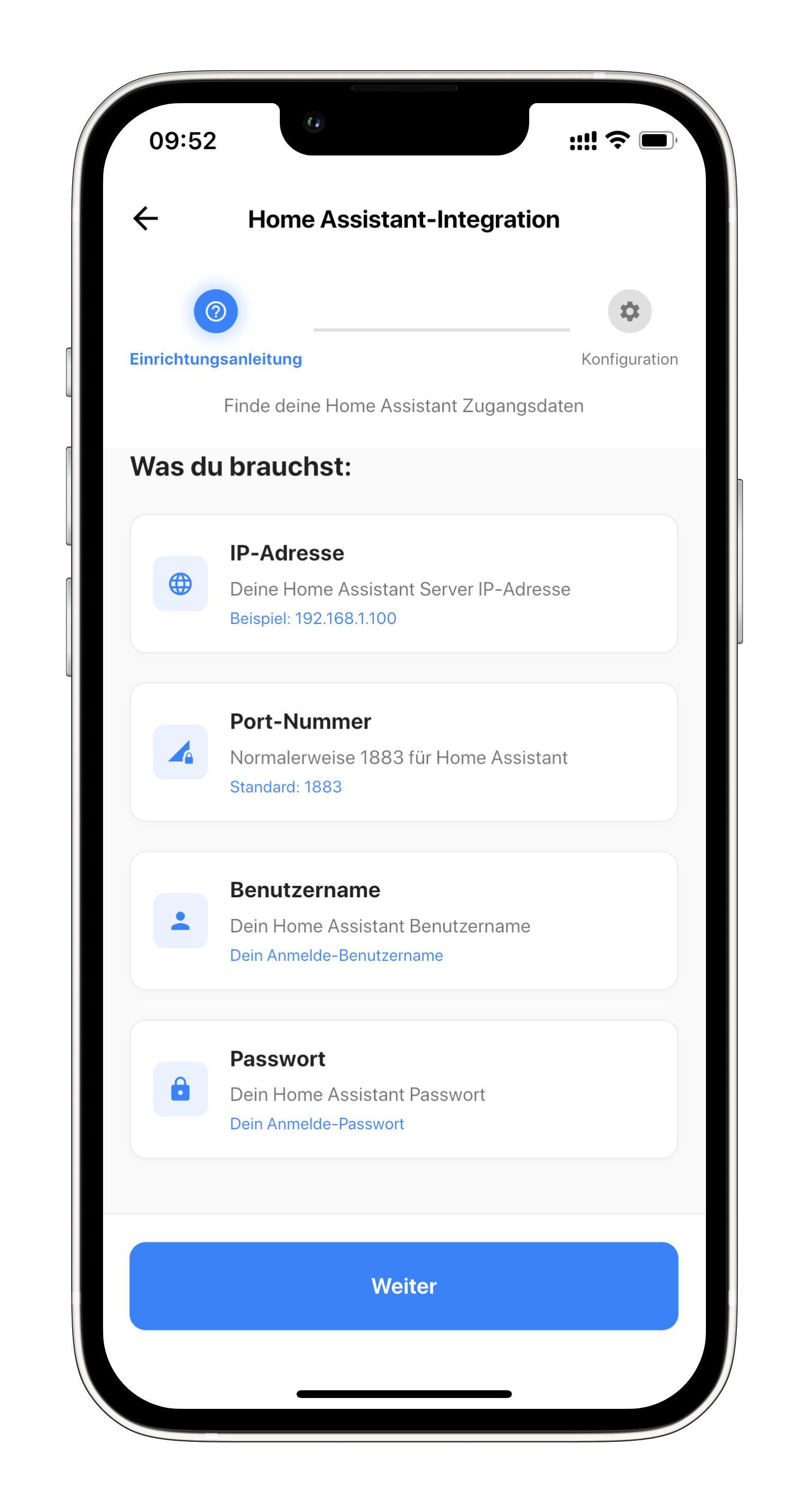 Bevor du mit dieser Anleitung beginnst, stelle sicher, dass du die Home Assistant Grundeinrichtung abgeschlossen hast. Sie benötigen die MQTT-Zugangsdaten (IP-Adresse, Benutzername, Passwort und Port).